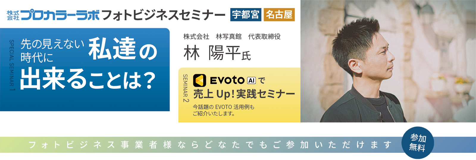 講演「先の見えない時代に私達の出来ることは?」では林写真館流集客術、話題の「EVOTOで売上Up実践セミナー 」では林陽平xEVOTOコラボセミナーも実施いたします。